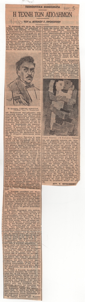 Απόκομμα εφημερίδας, στα ελληνικά, χαρτί, 9,5×10,3 εκ. Άρθρο του Άγγελου Προκοπίου για την τέχνη ελλήνων καλλιτεχνών που είναι μόνιμα εγκατεστημένοι στο εξωτερικό και ιδιαίτερα του Γιώργου Κωνσταντινόπουλου (George Constant). Εικονογραφείται με αναπαραγωγή πορτραίτου του καλλιτέχνη φιλοτεχνημένο από τον Άγγελο Προκοπίου και αναπαραγωγή έργου του καλλιτέχνη. Δίπλα στον τίτλο ημερομηνία δημοσίευσης.