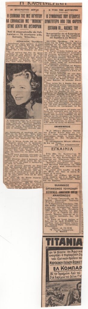 Στην άλλη όψη άρθρα επικαιρότητας: “Η επιμονή της μις Αιγύπτου να εμφανισθή με “μπικίνι” έγινε δεκτή με δυσφορίαν” και “Ο σύμβουλος που εγελούσε δυνατότερα από τον Φαρούκ. Έπταιαν οι … αδένες του”