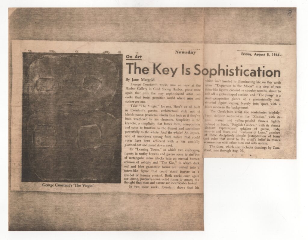 Φωτοαντίγραφο αποκόμματος εντύπου, στα αγγλικά, χαρτί, 21,7×27,8 εκ. Κριτική της Jane Margold για την ατομική έκθεση ζωγραφικής του Κονστάντ στη Νέα Υόρκη το 1966. Εικονογραφείται με αναπαραγωγή έργου.