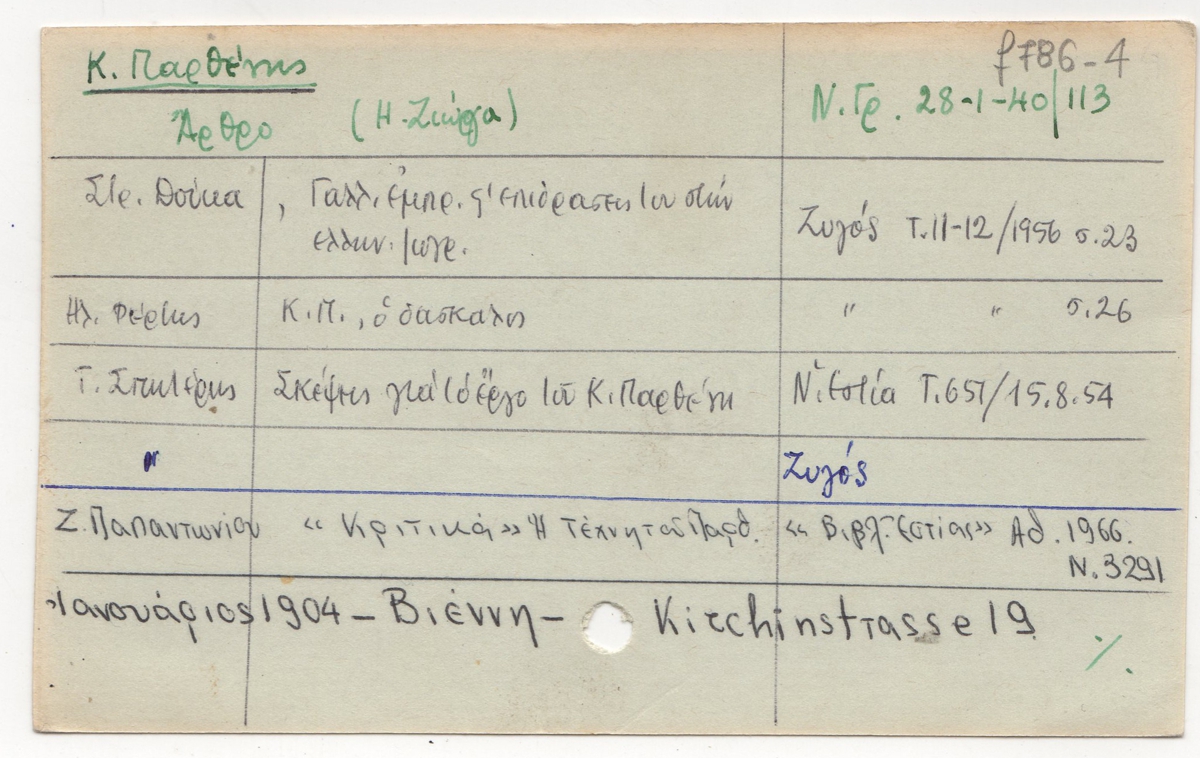 Βιβλιογραφικό δελτίο, χειρόγραφο, χαρτί διπλής όψης, 8×12,5 εκ., στα ελληνικά, με κριτικές για τον Κωνσταντίνο Παρθένη και το έργο του, δημοσιευμένες στον ελληνικό και ευρωπαϊκό Τύπο της περιόδου 1954-1966.
