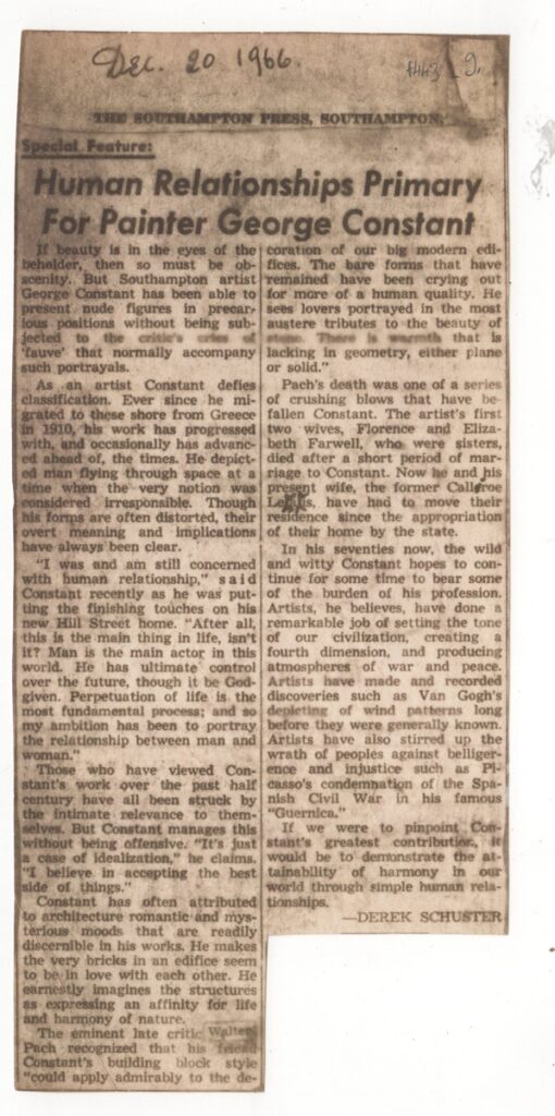 Φωτοαντίγραφο αποκόμματος εντύπου, στα αγγλικά, χαρτί, 23,0×10,7 εκ. Άρθρο του Derek Schuster για το έργο του έλληνα καλλιτέχνη Κονστάντ. Επάνω, επιγραφή με τα στοιχεία δημοσίευσης.