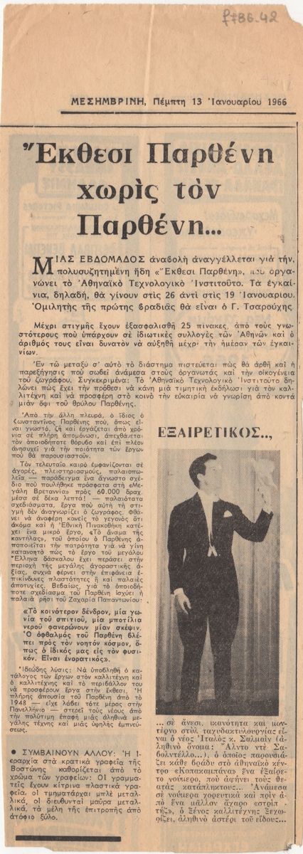 Απόκομμα, χαρτί, 28×10 εκ., στα ελληνικά, δημοσίευσης άρθρου αναφερόμενου σε αναβολή έκθεσης του Κωνσταντίνου Παρθένη, στο Αθηναϊκό Τεχνολογικό Ινστιτούτο.
