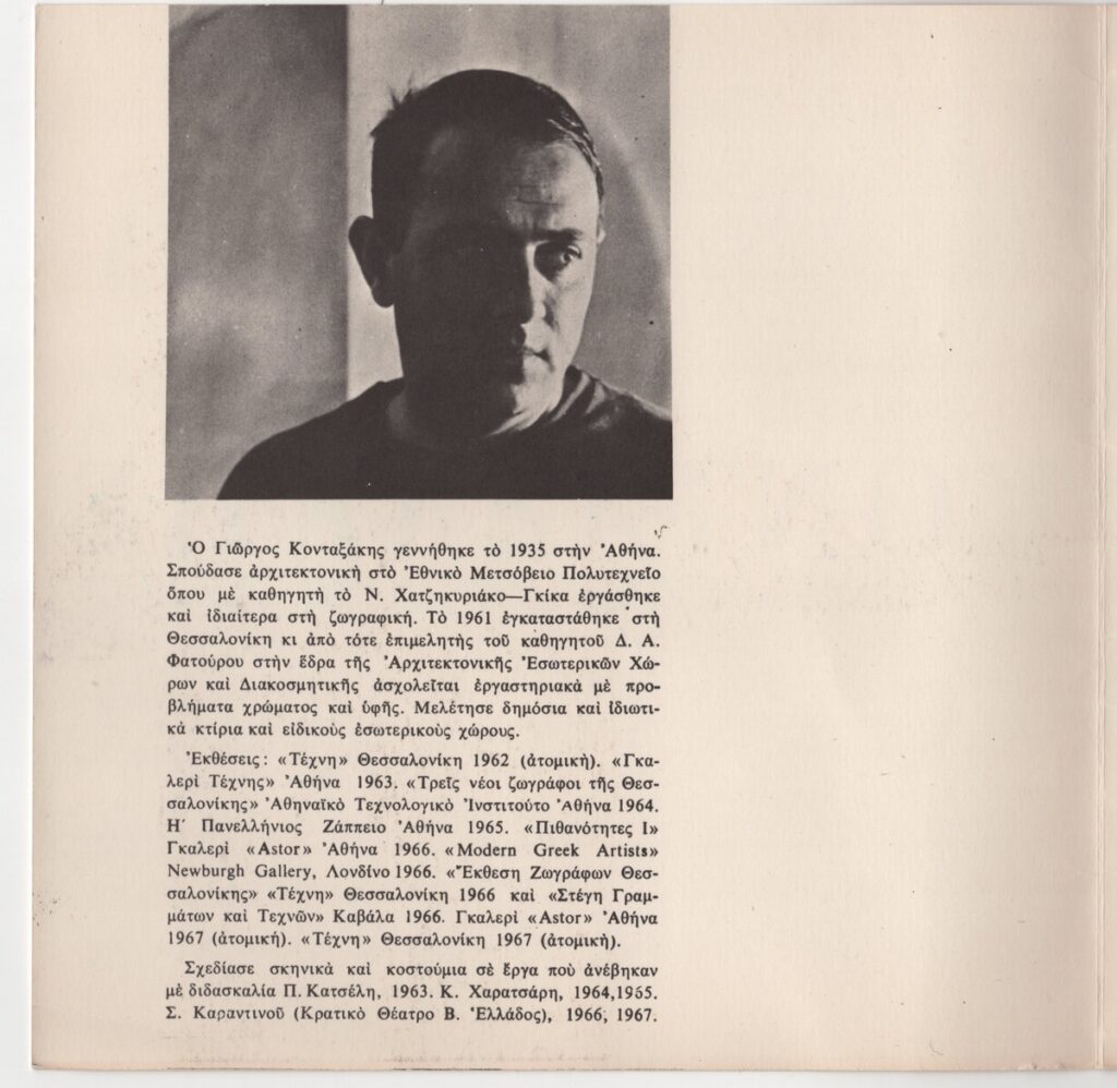Έντυπο έκθεσης, στα ελληνικά, τρίπτυχο, χαρτόνι, 19,4×19,4 εκ. Αφορά την ατομική έκθεση ζωγραφικής του Γιώργου Κονταξάκη στην Αθήνα και τη Θεσσαλονίκη το 1967. Περιέχει σύντομο βιογραφικό σημείωμα του καλλιτέχνη, κείμενα του Μανώλη Ανδρόνικου και του Δ. Α. Φατούρου (New Haven 09/02/1967). Εικονογραφείται με αναπαραγωγή έργου και φωτογραφίας του καλλιτέχνη.