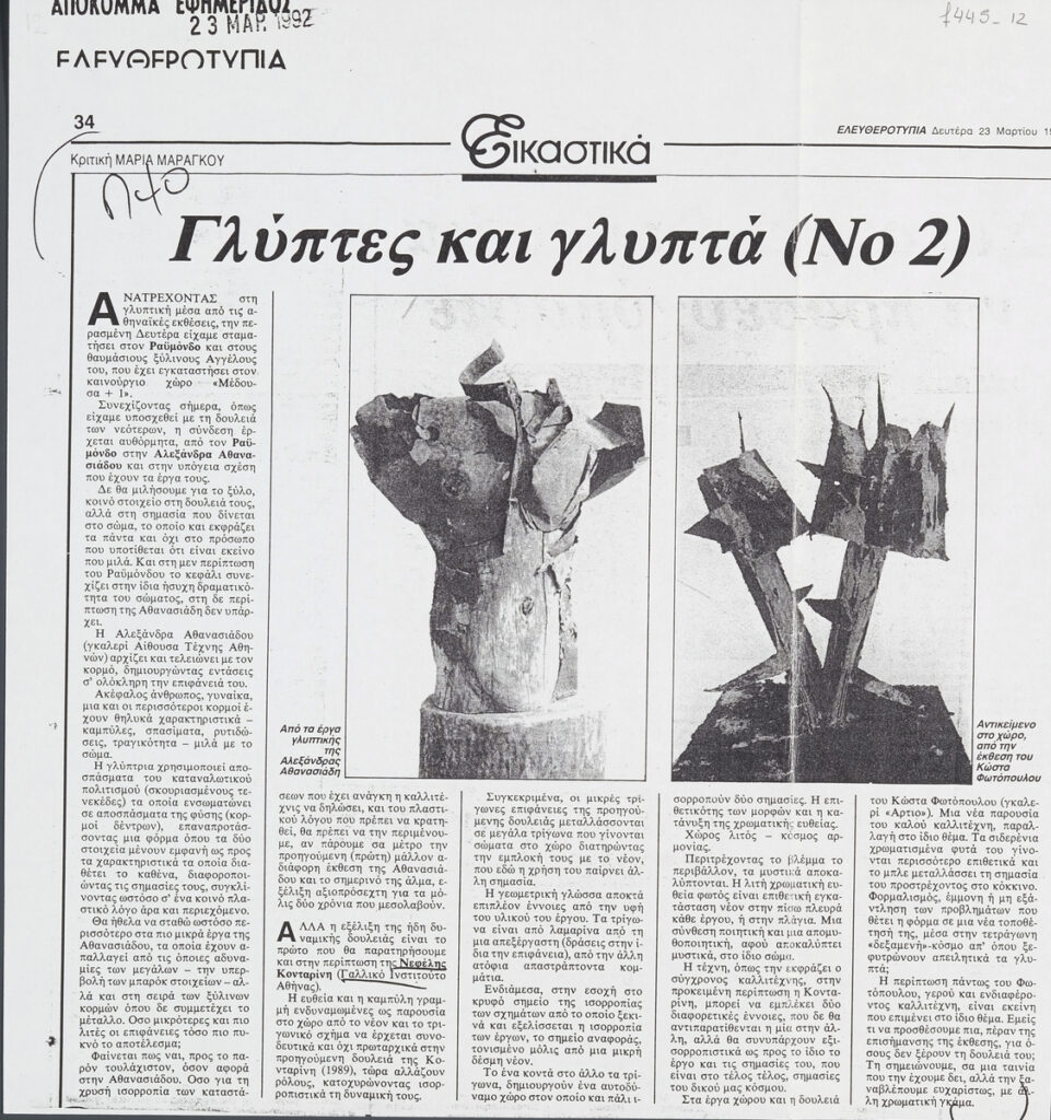 Φωτοαντίγραφο αποκόμματος της εφημερίδας “Ελευθεροτυπία” (23/03/1992). Κριτική της Μαρίας Μαραγκού για τις ατομικές εκθέσεις της Αλεξάνδρας Αθανασιάδου, της Νεφέλης Κονταρίνη και του Κώστα Φωτόπουλου στην Αθήνα το 1992. Αναφορά γίνεται επίσης στην έκθεση του Πάνου Ραϋμόνδου της ίδιας περιόδου.