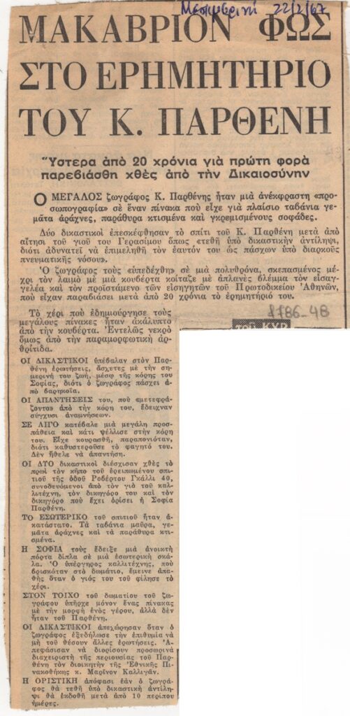 Απόκομμα, χαρτί ακανόνιστου μεγέθους, στα ελληνικά, δημοσίευσης άρθρου αναφερόμενου σε δικαστική διαμάχη του Κωνσταντίνου Παρθένη.
