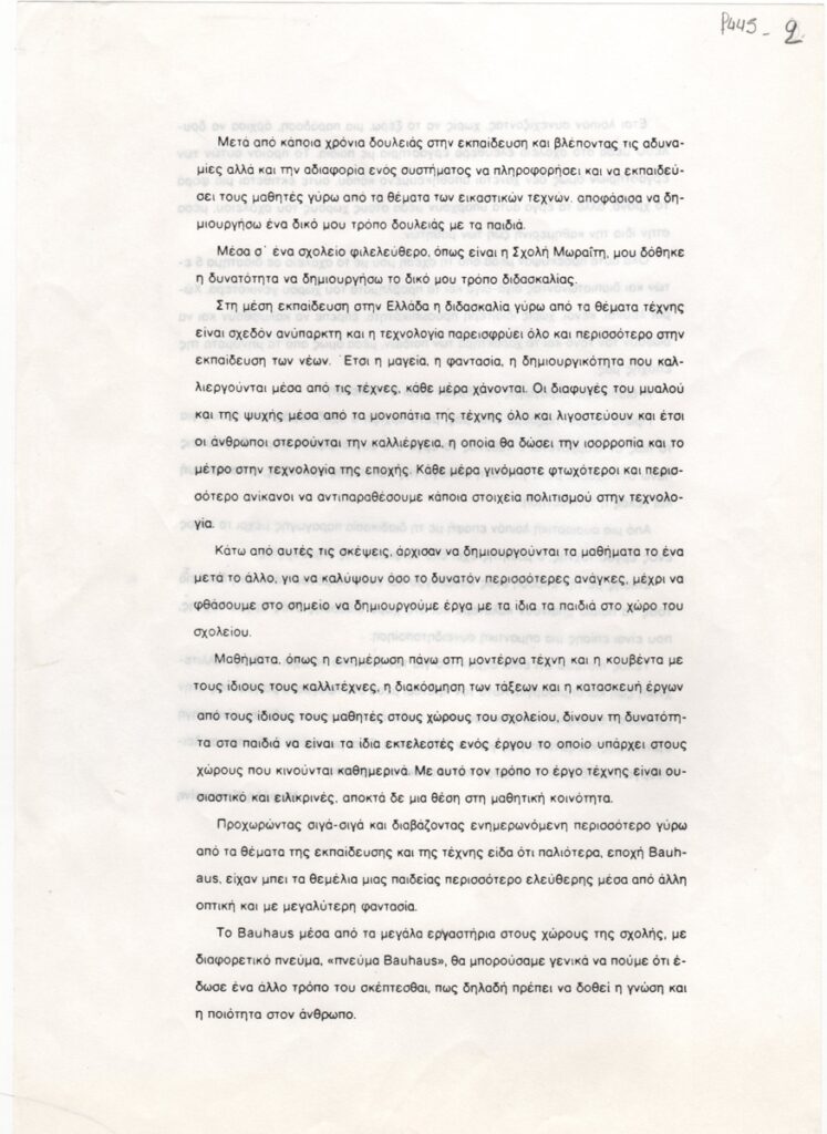Κείμενο, δακτυλόγραφο, στα ελληνικά, χαρτί, 29,8×21,0 εκ. Κείμενο της Νεφέλης Κονταρίνη σχετικά με την διδασκαλία της τέχνης στην εκπαίδευση και το πρόγραμμα που η ίδια δημιούργησε στη Σχολή Μωραΐτη.