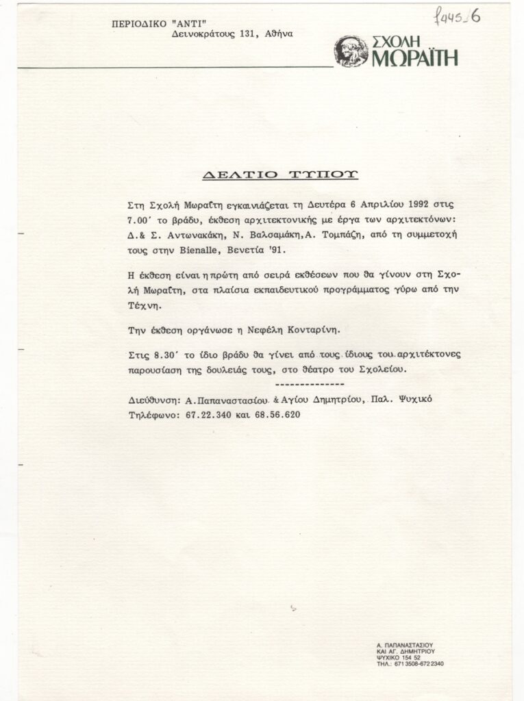 Κείμενο, δακτυλόγραφο, στα ελληνικά, χαρτί, 29,7×21,0 εκ. Δελτίο τύπου για την έκθεση αρχιτεκτονικής με έργα Δ. & Σ. Αντωνακάκη, Ν. Βαλσαμάκη και Α. Τομπάζη που διοργάνωσε η Νεφέλη Κονταρίνη στη Σχολή Μωραΐτη το 1992.