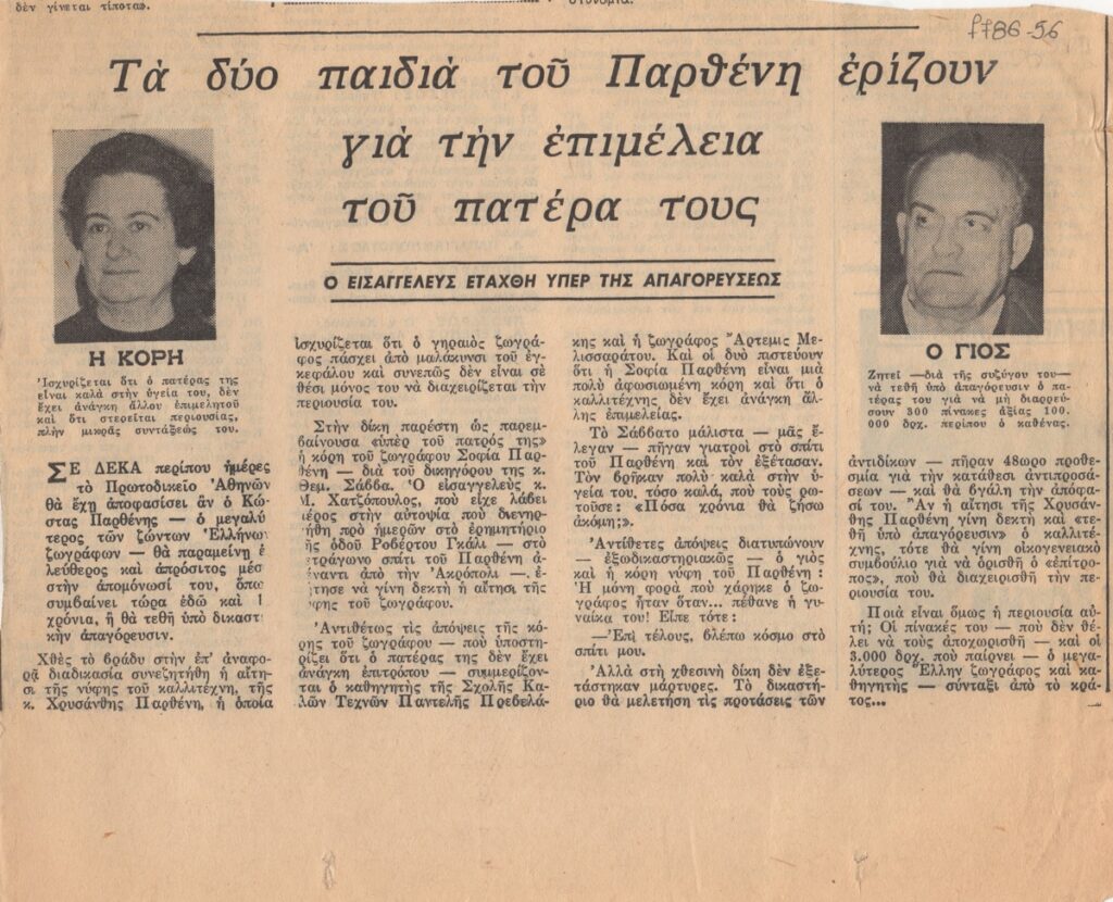 Απόκομμα, χαρτί, 17×20,5 εκ., στα ελληνικά, δημοσίευσης άρθρου αναφερόμενου σε διαμάχη των παιδιών του Κωνσταντίνου Παρθένη αναφορικά με την επιμέλεια του καλλιτέχνη.