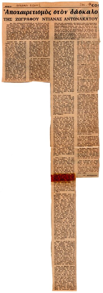Απόκομμα, χαρτί ακανόνιστου μεγέθους, στα ελληνικά, δημοσίευσης άρθρου αναφερόμενου στο εικαστικό έργο του Κωνσταντίνου Παρθένη. Μεταφέρονται αναμνήσεις για τον καλλιτέχνη.