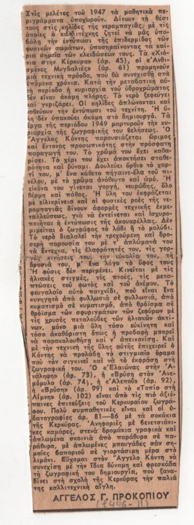 Απόκομμα, έντυπο, στα ελληνικά, χαρτί, 2 φφ., 5,3×4,8 και 16,5×5,4 εκ. Κριτική του Άγγελου Γ. Προκοπίου για την αναδρομική έκθεση ζωγραφική του Άγγελου Κόντη στην Αθήνα το 1949. Κάτω από τον τίτλο επιγραφή με τη χρονιά δημοσίευσης.