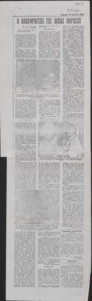 Φωτοαντίγραφο, χαρτί, 64×19.5 εκ., στα ελληνικά, δημοσίευσης τμήματος άρθρου αναφερόμενου σε δικαστική απόφαση αναφορικά με το σπίτι/ καλλιτεχνικό έργαστήριο του Κωνσταντίνου Παρθένη.