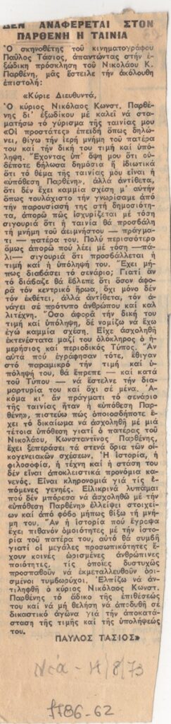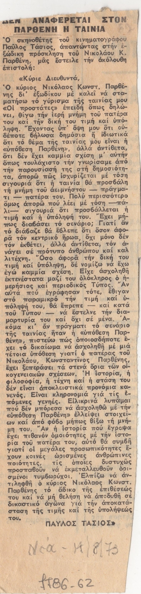 Απόκομμα, χαρτί, 19,5×5 εκ., στα ελληνικά, δημοσίευσης επιστολής του Παύλου Τάσιου, στον διευθυντή του εντύπου, αναφορικά με εξώδικο που έλαβε για ταινία που σχετίζεται με τον Κωνσταντίνο Παρθένη.