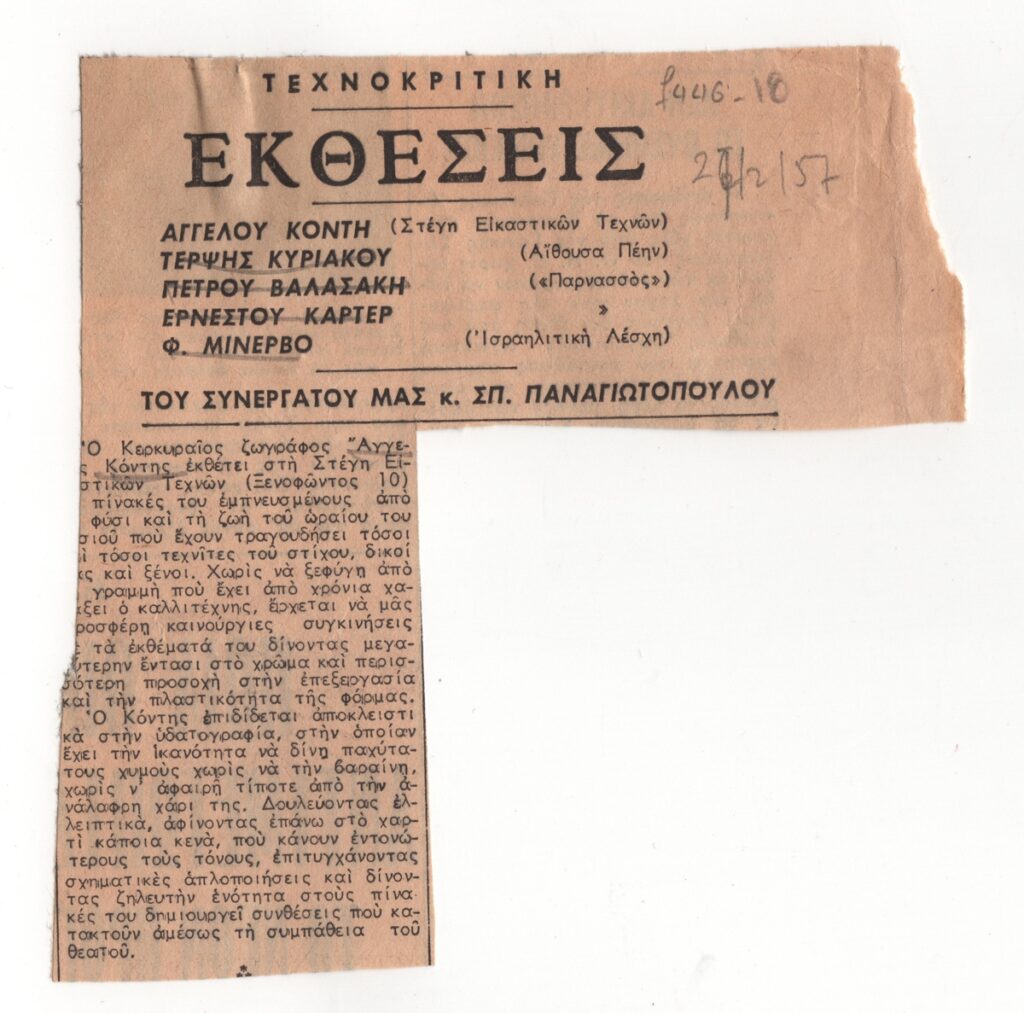 Απόκομμα, έντυπο, στα ελληνικά, χαρτί, 12,0×11,5 εκ., όπου δημοσιεύεται κριτική των εκθέσεων της περιόδου του Σπ. Παναγιωτόπουλου. Αναφέρεται στην ατομική έκθεση ζωγραφικής του Άγγελου Κόντη στην Αθήνα το 1957. Οι κριτικές των εκθέσεων της Τέρψης Κυριακού, Πέτρου Βαλασάκη, Ερνέστου Κάρτερ και Φ. Μινερβό έχουν αφαιρεθεί κατά την αποδελτίωση. Δεξιά επιγραφή με την ημερομηνία της δημοσίευσης.