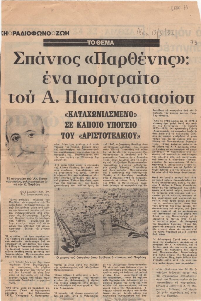Απόκομμα, χαρτί, 31×21.5 εκ., στα ελληνικά, δημοσίευσης άρθρου αναφερόμενου σε πορτραίτο του Αλέξανδρου Παπαναστασίου, το οποίο φιλοτέχνησε ο Κωνσταντίνος Παρθένης και το οποίο ανακαλύφθηκε σε υπόγειο της Φιλοσοφικής Σχολής του ΑΠΘ.