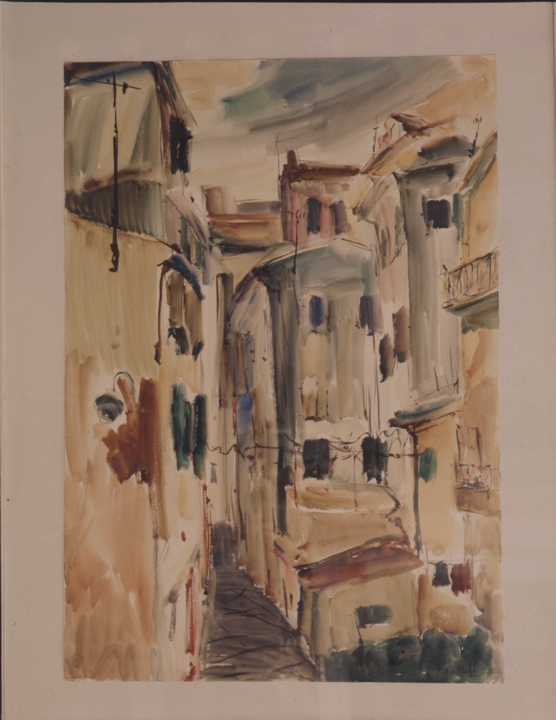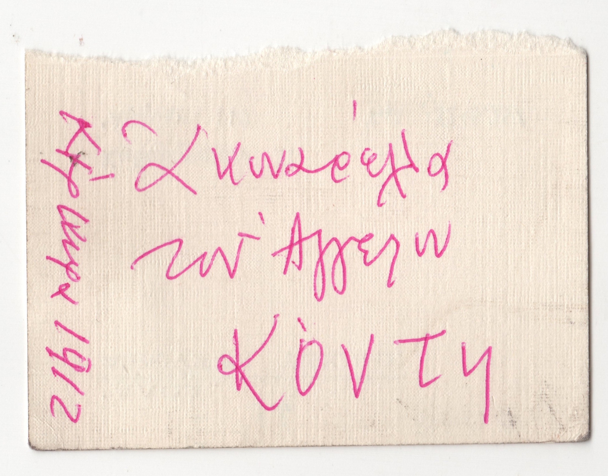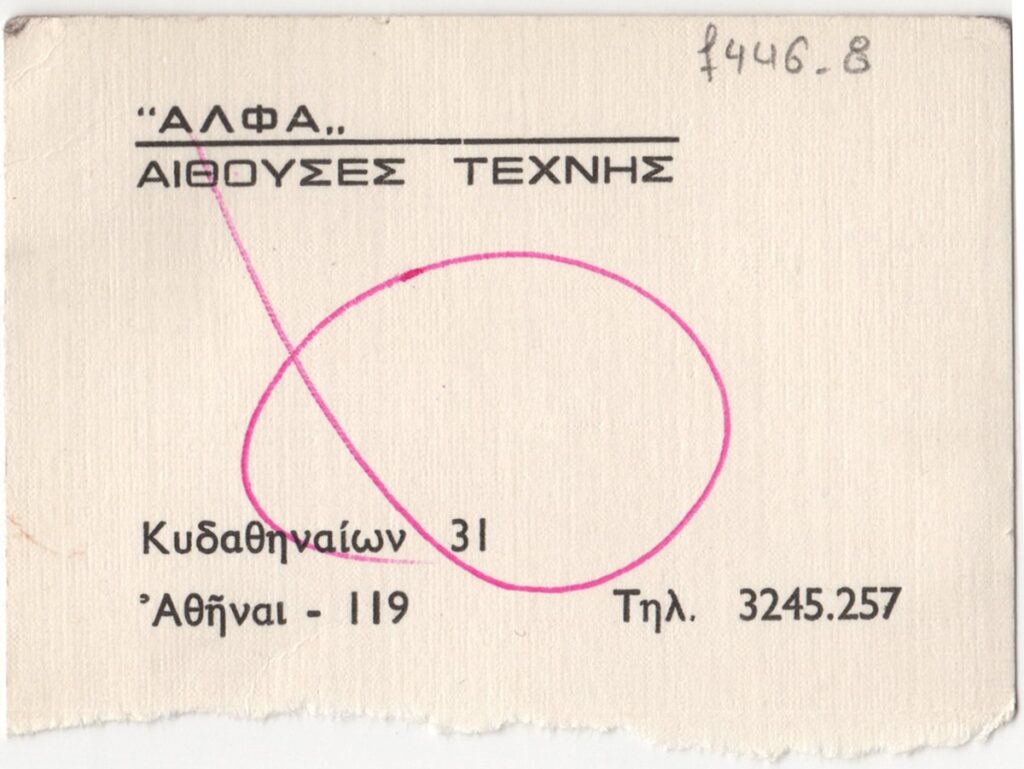 Διαφάνεια, έγχρωμη, θετικό φιλμ, 6,2×7,1 εκ. Αναπαραγωγή έργου του Άγγελου Κόντη. Συνοδεύεται από απόκομμα εντύπου των Αιθουσών Τέχνης “ΑΛΦΑ”, στα ελληνικά, χαρτόνι, 6,1×8,3 εκ. Στην πίσω όψη επγιραφή.