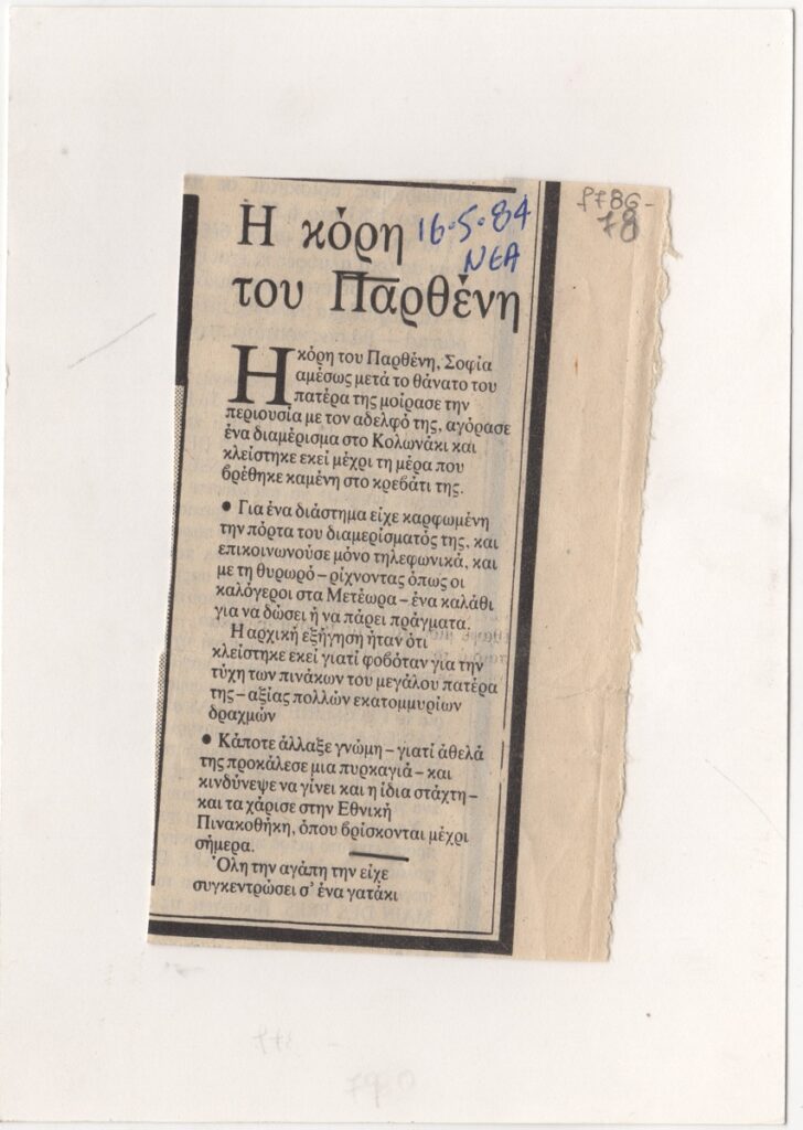 Απόκομμα, χαρτί συρραμμένο σε έντυπο, 17×12 εκ., στα ελληνικά, δημοσίευσης άρθρου αναφερόμενου στον θάνατο της κόρης του Κώστα Παρθένη Σοφίας.