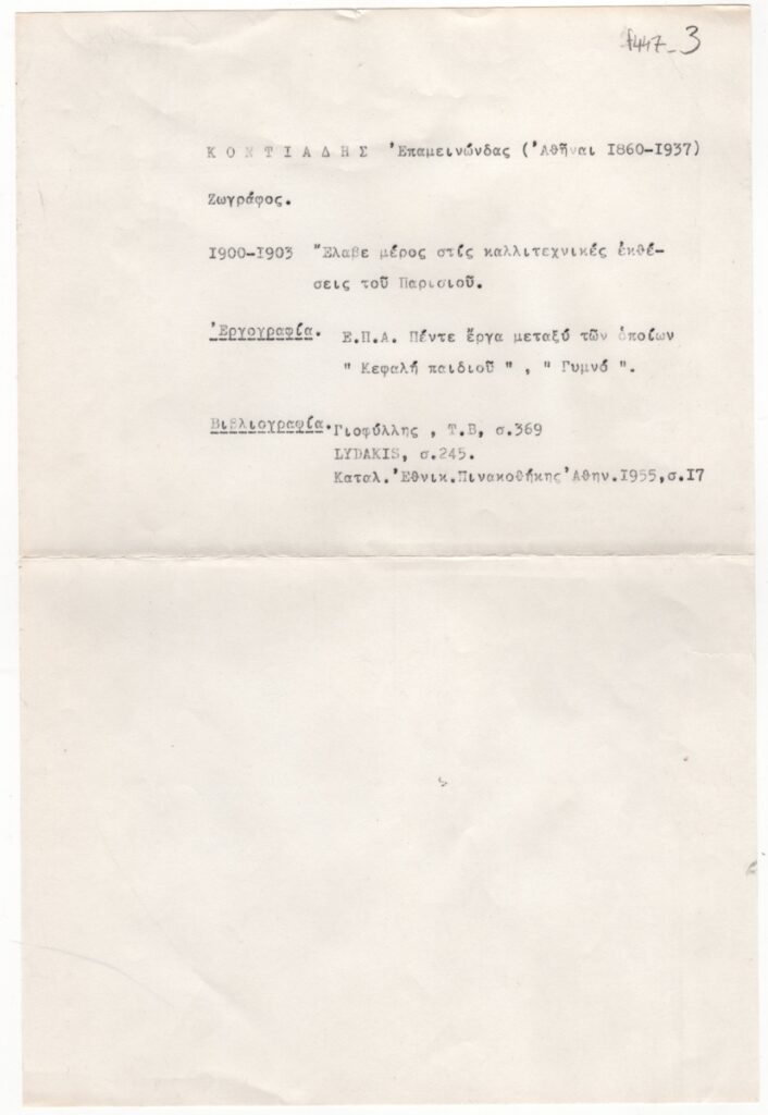 Κείμενο, δακτυλόγραφο, στα ελληνικά, χαρτί, 30,0×20,0 εκ. Βιογραφικά στοιχεία για τον ζωγράφο Επαμεινώνδα Κοντιάδη. Περιλαμβάνονται στοιχεία για τις συμμετοχές του σε εκθέσεις στο Παρίσι, εργογραφία και βιβλιογραφία.