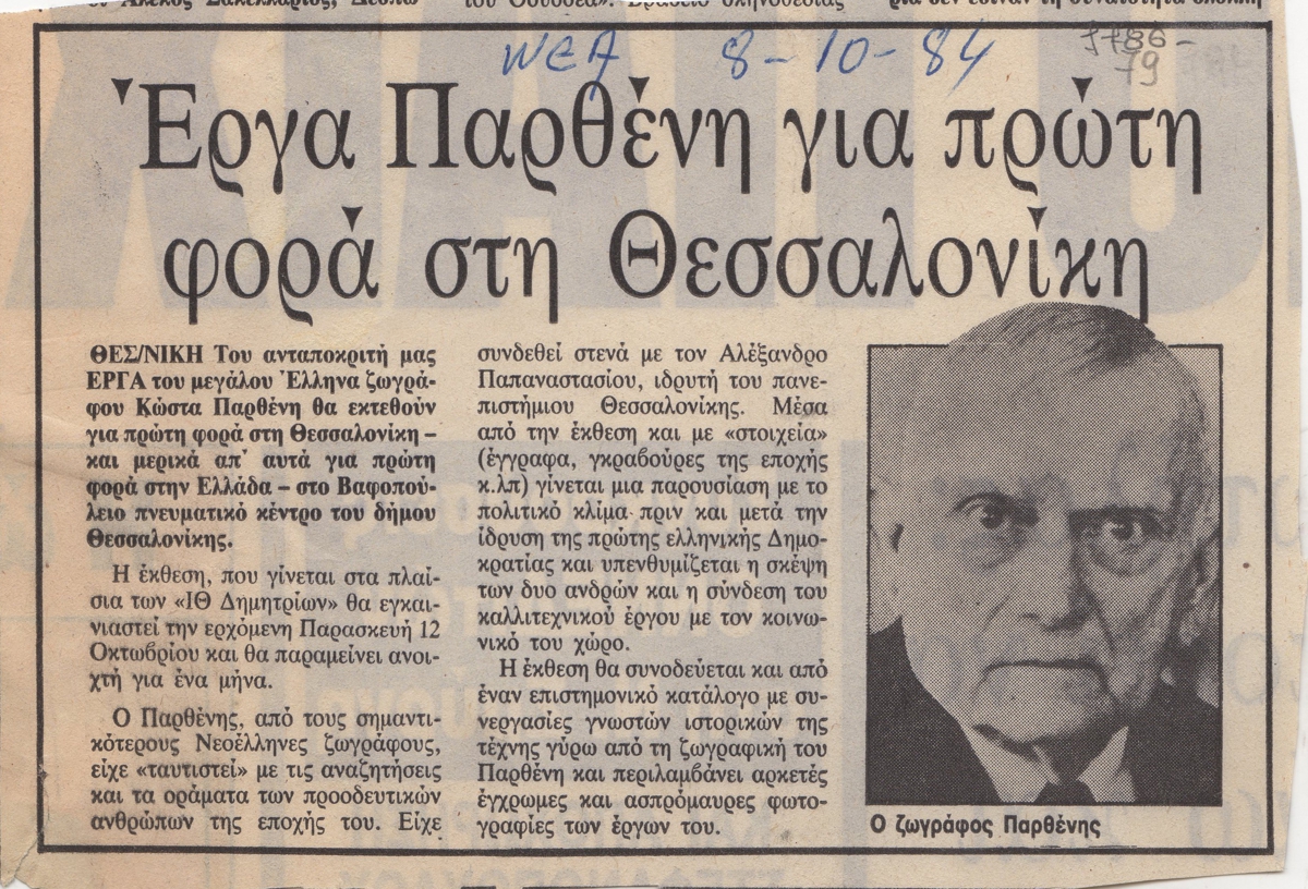 Απόκομμα, χαρτί, 11×16 εκ., στα ελληνικά, δημοσίευσης άρθρου αναφερόμενου σε έκθεση του Κώστα Παρθένη, που θα διεξαχθεί στο Βαφοπούλειο Πνευματικό Κέντρο της Θεσσαλονίκης.