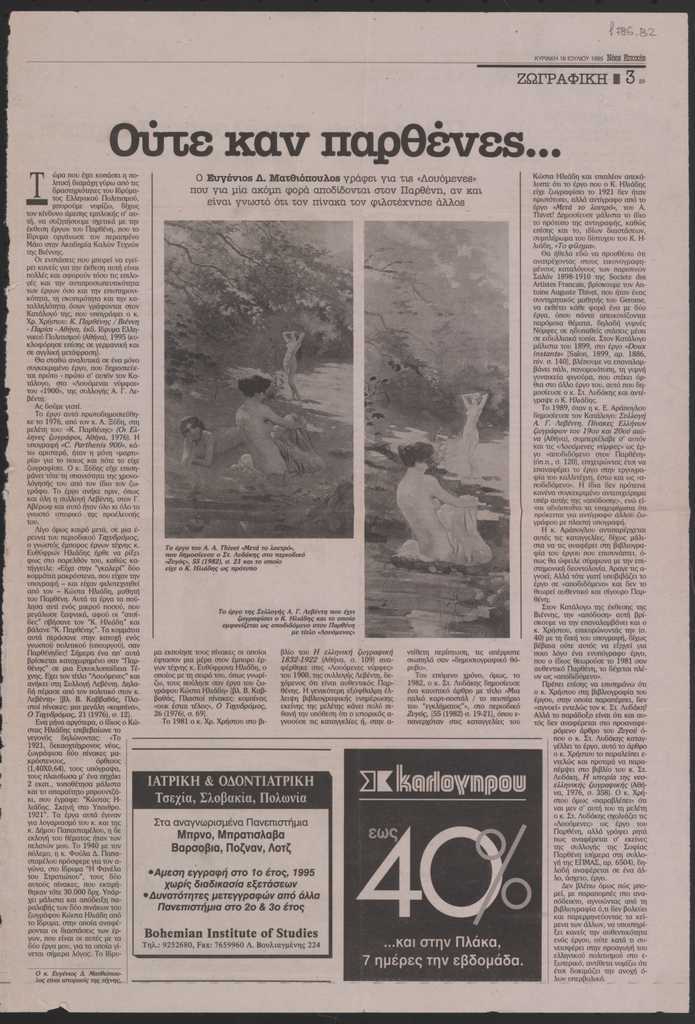 Απόκομμα, χαρτί, 47×29,5 εκ., στα ελληνικά, δημοσίευσης άρθρου αναφερόμενου σε έργα που αποδίδονται στον Κώστα Παρθένη ενώ δεν είναι δικά του, με αφορμή έκθεση έργων του καλλιτέχνη στην Βιέννη. Δίνονται αποσπάσματα σχετικών δημοσιεύσεων.