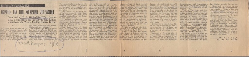 Απόκομμα, χαρτί, 10×43 εκ., στα ελληνικά, δημοσίευσης άρθρου του Τάκη Παρλαβάντζα, αναφερόμενου στη σύγχρονη ζωγραφική.