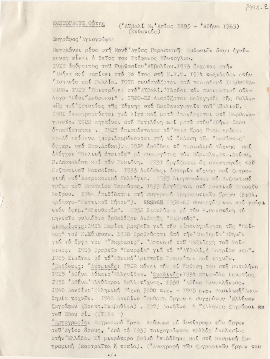 Δακτυλόγραφο κείμενο με βιογραφικά στοιχεία του Φώτη Κόντογλου. Περιέχει προσωπικές πληροφορίες, διακρίσεις, εκθέσεις, εργογραφία και βιβλιογραφία του καλλιτέχνη.