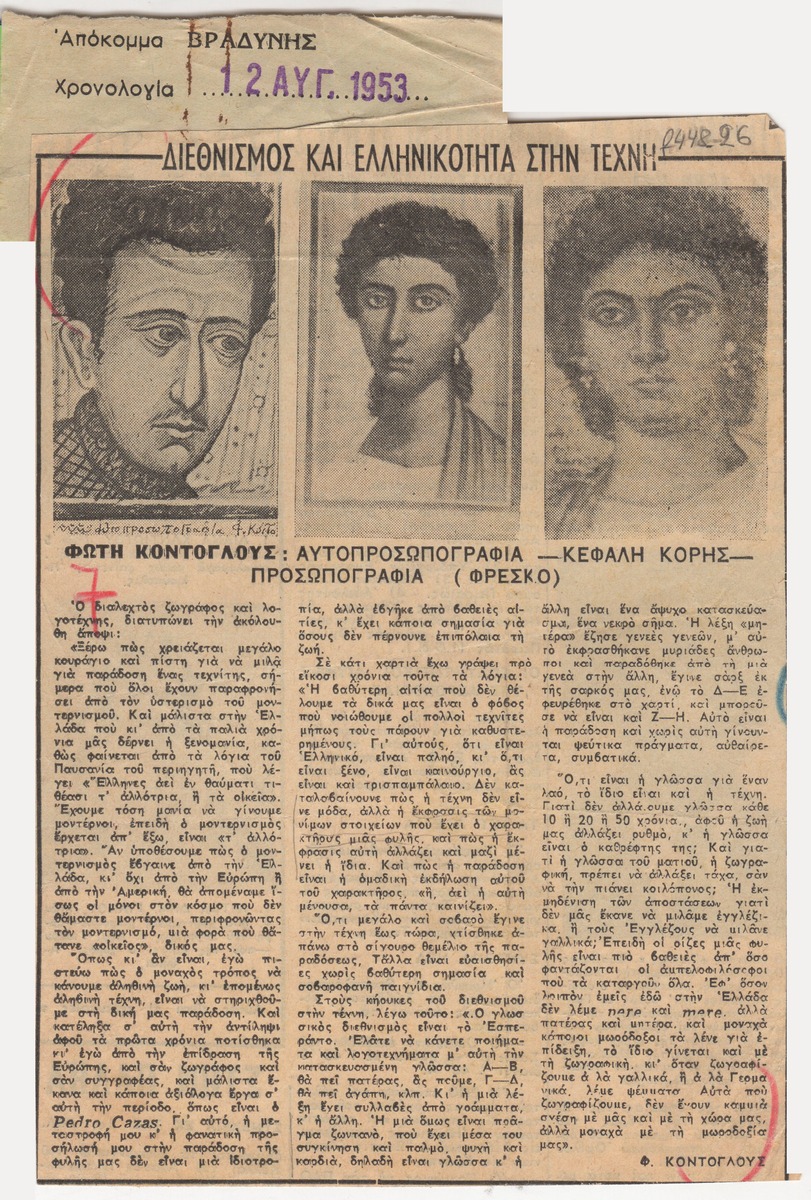 Απόκομμα της εφημερίδας “Η Βραδυνή” (12/08/1953) δημοσίευσης κειμένου του Φώτη Κόντογλου, στο οποίο αναφέρεται σε έργα του.
