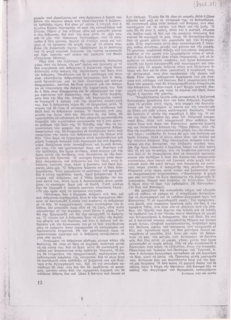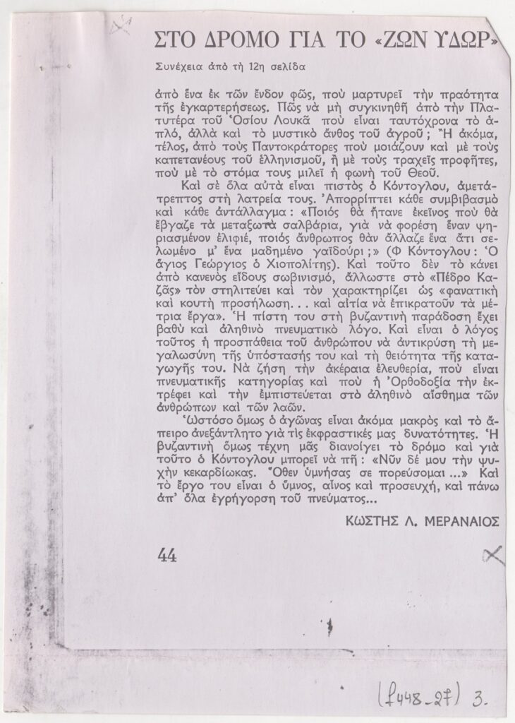 Φωτοαντίγραφο, χαρτί, 3 φφ, 30×21 και 16×11.5 εκ., στα ελληνικά, δημοσίευσης άρθρου αναφερόμενου στο λογοτεχνικό και αγιογραφικό έργο του Φώτη Κόντογλου.