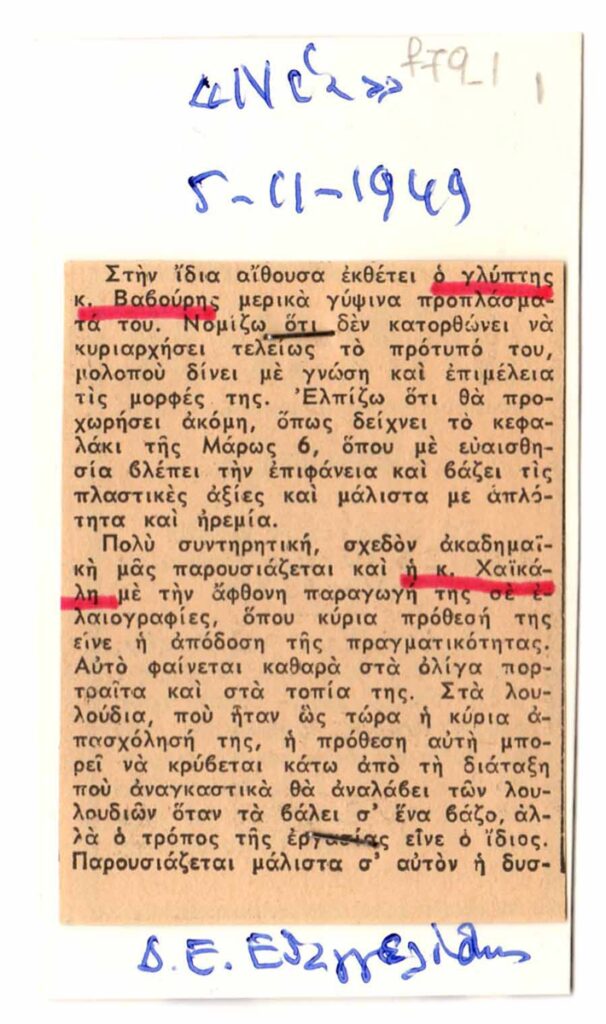 Απόκομμα, χαρτί, συρραμένο σε απόκομμα πρόσκλησης εγκαινίων έκθεσης, με συνολικές διαστάσεις 9×5 εκ., στα ελληνικά, δημοσίευσης κριτικής για τις ατομικές εκθέσεις των Βαβούρη Ευριπίδη και Χαϊκάλη Μαρίνας.