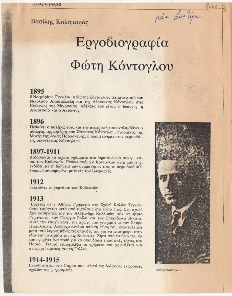Φωτοαντίγραφο, χαρτί, 6 φφ, 23,5×19 εκ., στα ελληνικά, δημοσίευσης εργο-βιογραφίας του Φώτη Κόντογλου.Το απόκομμα εικονογραφείται.