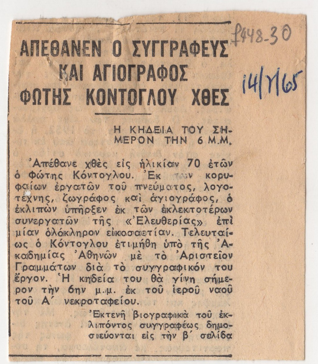 Απόκομμα εφημερίδας (14/07/1965) δημοσίευσης άρθρου αναφερόμενου στον θάνατο του Φώτη Κόντογλου.