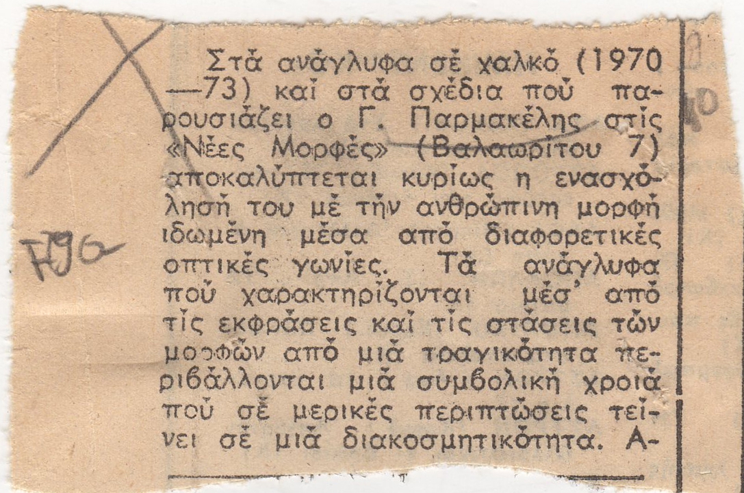 Απόκομμα, χαρτί, 2 φφ, 5×7 και 14×5 εκ., στα ελληνικά, δημοσίευσης κριτικής έκθεσης του Γιάννη Παρμακέλη, η οποία διεξάγεται στην Γκαλερί Νέες Μορφές στην Αθήνα.
