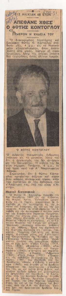 Απόκομμα της εφημερίδας “Η Καθημερινή” (14/07/1965) δημοσίευσης άρθρου αναφερόμενου στον θάνατο του Φώτη Κόντογλου.