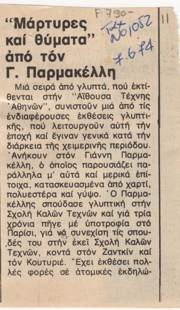 Απόκομμα, χαρτί, 2 φφ, 10×6 και 15,5×11 εκ., στα ελληνικά, δημοσίευσης κριτικής έκθεσης του Γιάννη Παρμακέλη, η οποία διεξάγεται στην Αίθουσα Τέχνης Αθηνών.