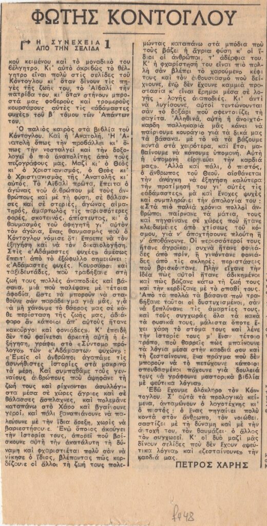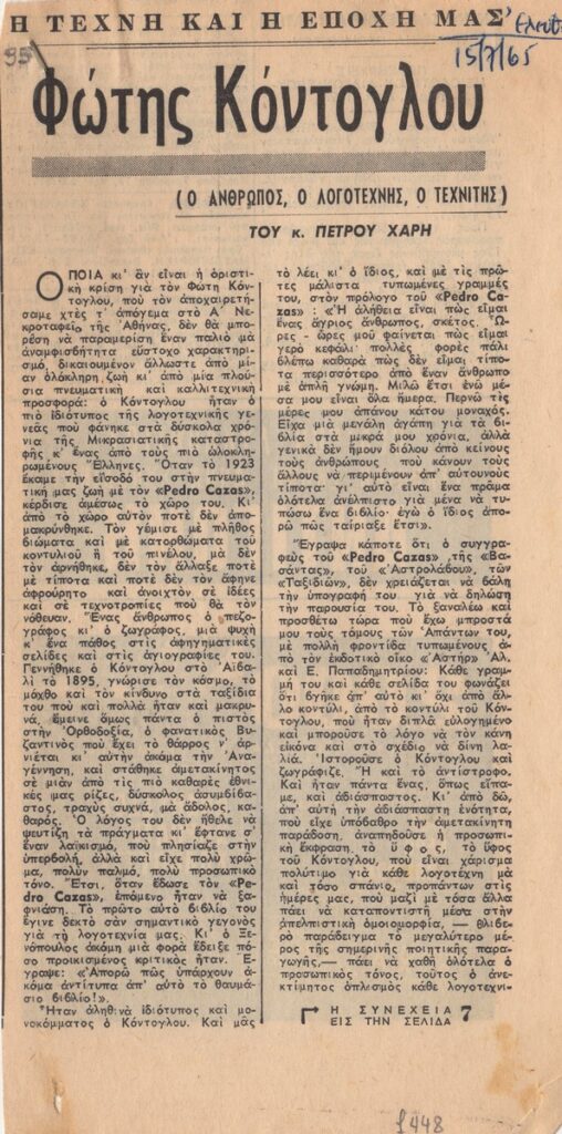 Απόκομμα της εφημερίδας “Ελευθερία” (15/07/1965) δημοσίευσης άρθρου αφιερωμένου στο λογοτεχνικό και εικαστικό έργο του Φώτη Κόντογλου.