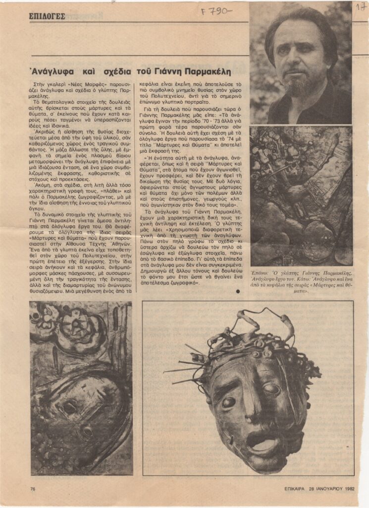 Απόκομμα, χαρτί, 29×21 εκ., στα ελληνικά, δημοσίευσης κριτικής έκθεσης του Γιάννη Παρμακέλη, η οποία διεξάγεται στην Γκαλερί Νέες Μορφές.