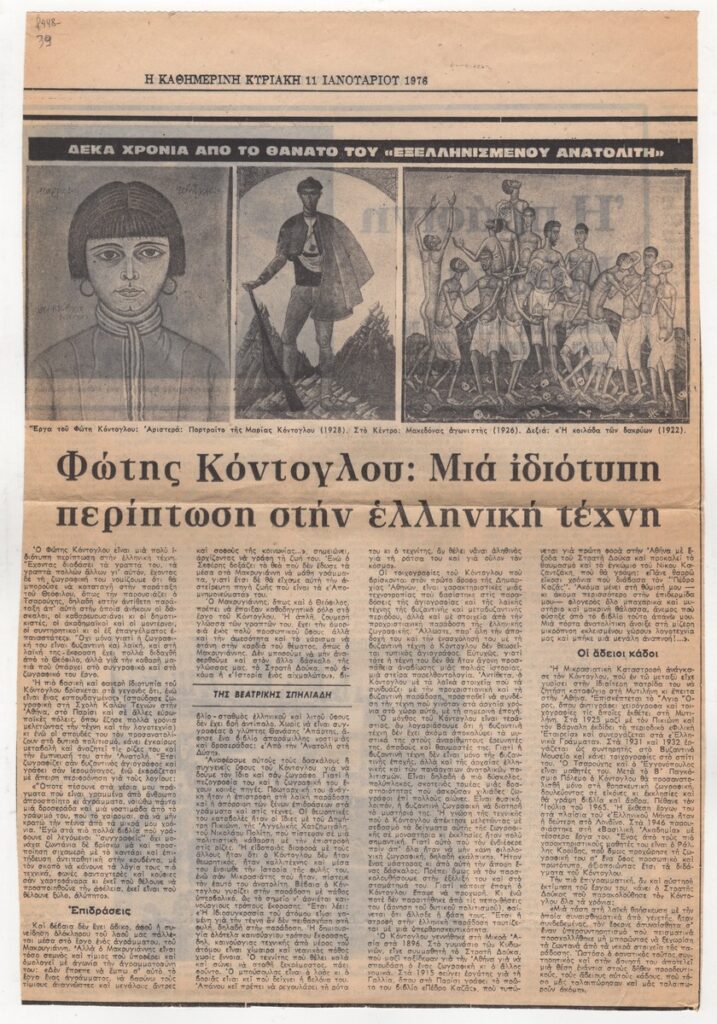 Απόκομμα της εφημερίδας “Η Καθημερινή” (11/01/1976) δημοσίευσης άρθρου για τον Φώτη Κόντογλου και το ζωγραφικό του έργο.