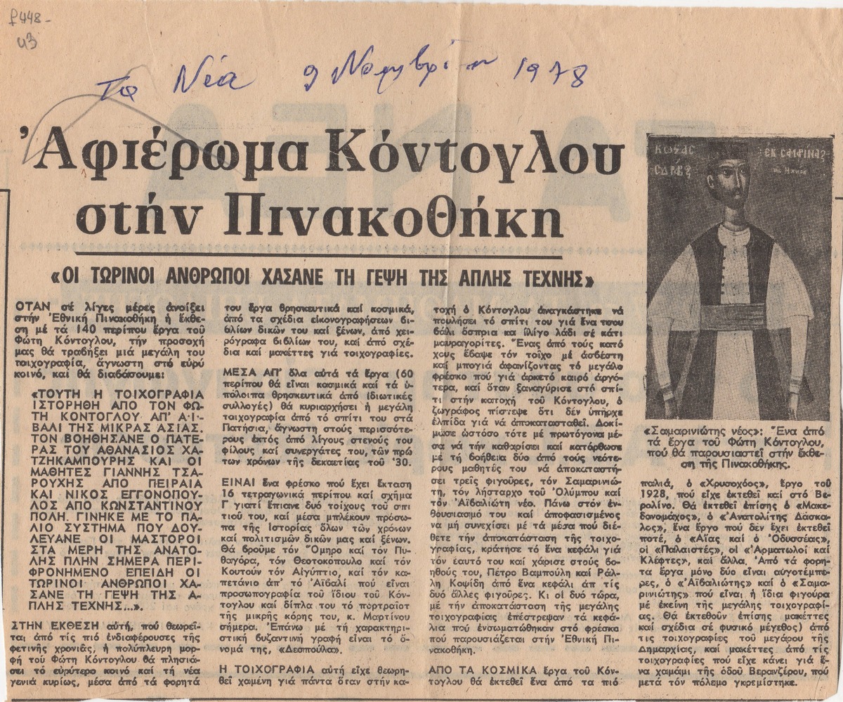 Απόκομμα της εφημερίδας “Τα Νέα” (09/11/1978) δημοσίευσης κριτικής αναδρομικής έκθεσης της Εθνικής Πινακοθήκης αφιερωμένης στον Φώτη Κόντογλου.