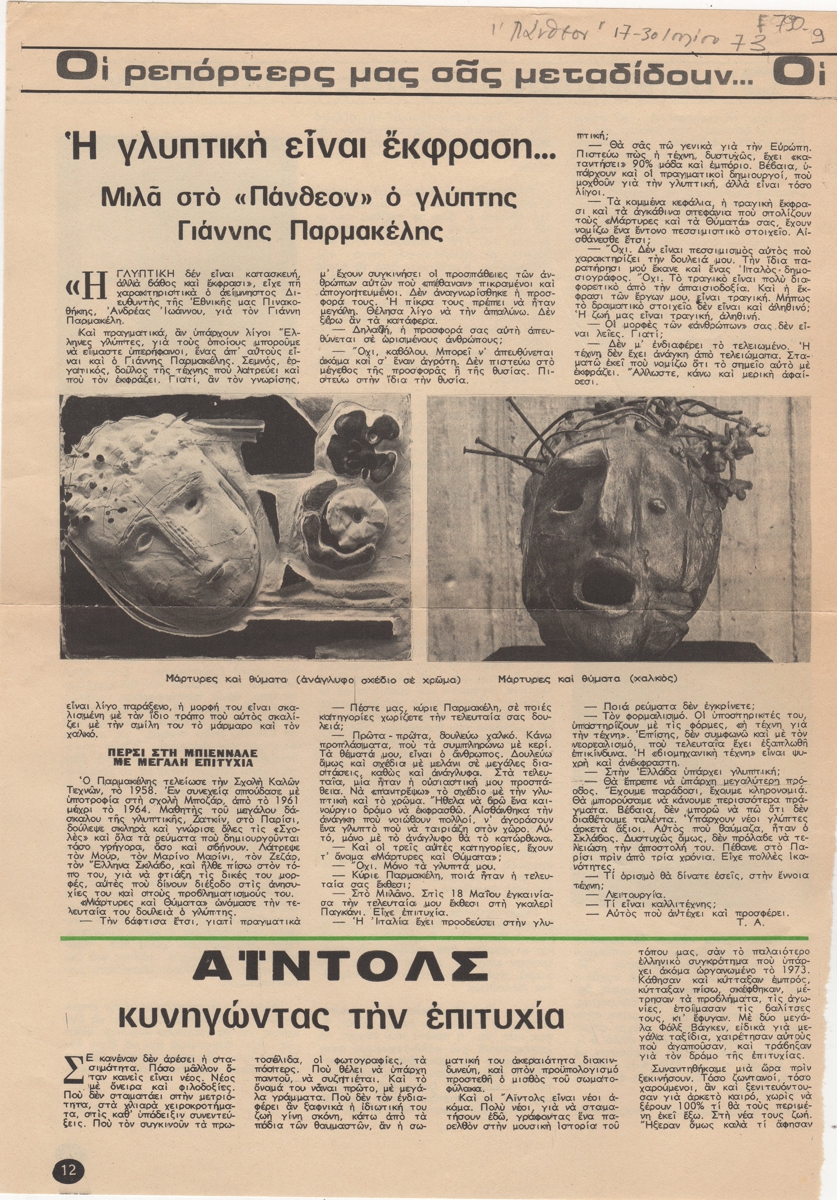 Απόκομμα, χαρτί, 29.5×21 εκ., στα ελληνικά, δημοσίευσης άρθρου με κείμενο που μεταφέρει κρίσεις του Γιάννη Παρμακέλη για το εικαστικό του έργο.