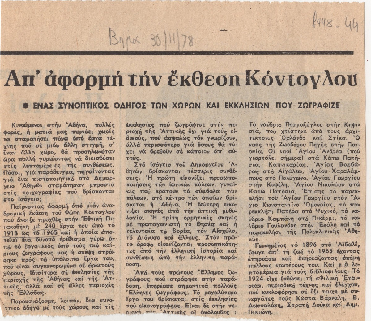 Απόκομμα της εφημερίδας “Το Βήμα” (30/11/1978) δημοσίευσης κριτικής αναδρομικής έκθεσης του Φώτη Κόντογλου στην Εθνική Πινακοθήκη Αθηνών.