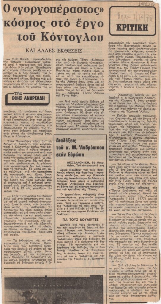 Απόκομμα, χαρτί, 29×15 εκ., στα ελληνικά, δημοσίευσης κριτικών εκθέσεων. Ειδικότερα, γίνεται λόγος για την αναδρομική έκθεση με έργα Φώτη Κόντογλου στην Εθνική Πινακοθήκη Αθηνών, για την ομαδική έκθεση Άγγλων ζωγράφων στο Βρετανικό Συμβούλιο, για την ομαδική έκθεση χαρακτικής στην γκαλερί Σύγχρονη Χαρακτική, για την ατομική έκθεση του Σωτήρη Μπαρούνα, για την ατομική έκθεση της Δέσπως Μαγκώνη, για την ατομική έκθεση του Αγήνορα Αστεριάδη στην Ώρα, για την έκθεση του Βασίλη Βασιλειάδη στην Εταιρεία Διάδοσης Σύγχρονης Τέχνης, για την έκθεση του Σπύρου Βασιλείου στο Τρίτο Μάτι και για την έκθεση του Γιώργου Λολοσίδη στην Συλλογή. Επίσης, γίνεται λόγος για διαλέξεις του Μανώλη Ανδρόνικου στην Ευρώπη, αναφορικά με τους τάφους στη Βεργίνα.