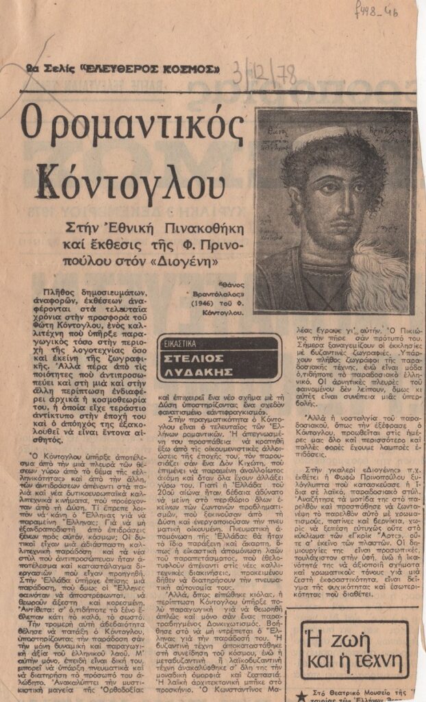 Απόκομμα της εφημερίδα «Ελεύθερος Κόσμος» (03/12/1978) δημοσίευσης κριτικής αναδρομικής έκθεσης του Φώτη Κόντογλου που διεξάγεται στην Εθνική Πινακοθήκη. Επίσης, γίνεται λόγος για την ατομική έκθεση ζωγραφικής της Φωφώς Πρινοπούλου στην γκαλερί Διογένης.