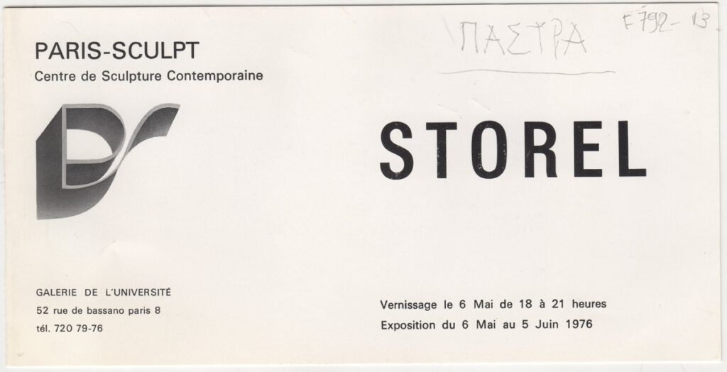 Έντυπο, χαρτί ιλλουστρασιόν, 2 φφ, 10,5×21 εκ., στα γαλλικά, έκθεσης Storel στο Centre de Sculpture Contemporaine στο Παρίσι. Περιέχει βιογραφικό σημείωμα του καλλιτέχνη.