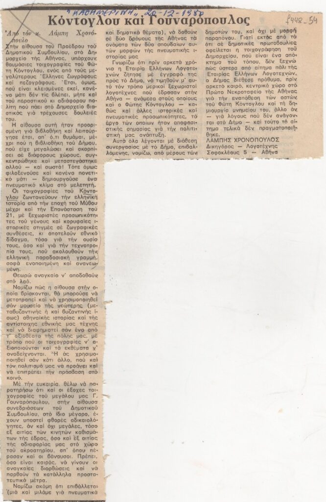 Απόκομμα της εφημερίδας “Η Καθημερινή” (20/12/1980) δημοσίευσης κριτικής τοιχογραφιών των Φώτη Κόντογλου και Γιώργου Γουναρόπουλου σε αίθουσες του Δημοτικού Συμβουλίου Αθηνών.