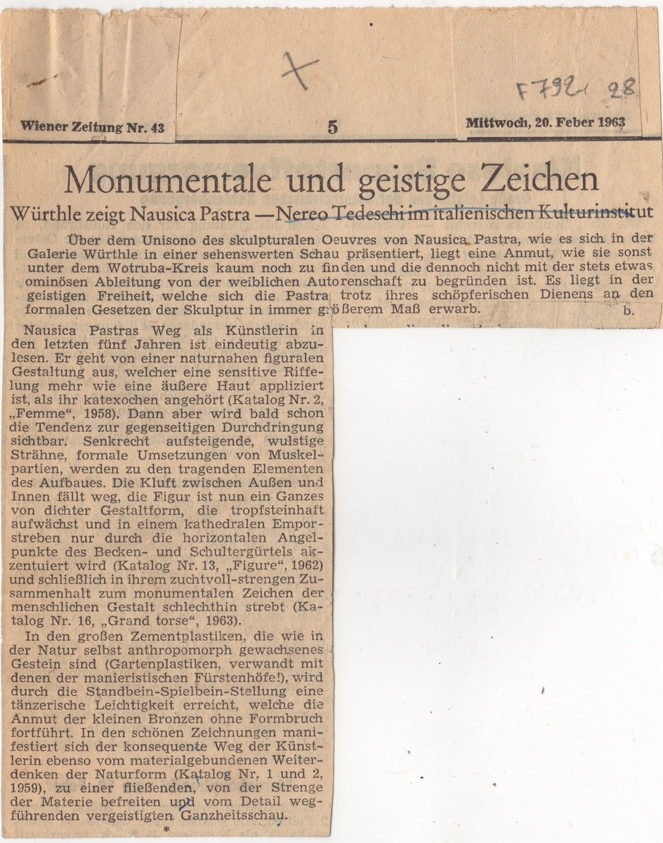 Απόκομμα, χαρτί ακανόνιστου μεγέθους, στα γερμανικά, δημοσίευσης κριτικής έκθεσης της Ναυσικάς Πάστρα, η οποία διεξάγεται στην Βιέννη.