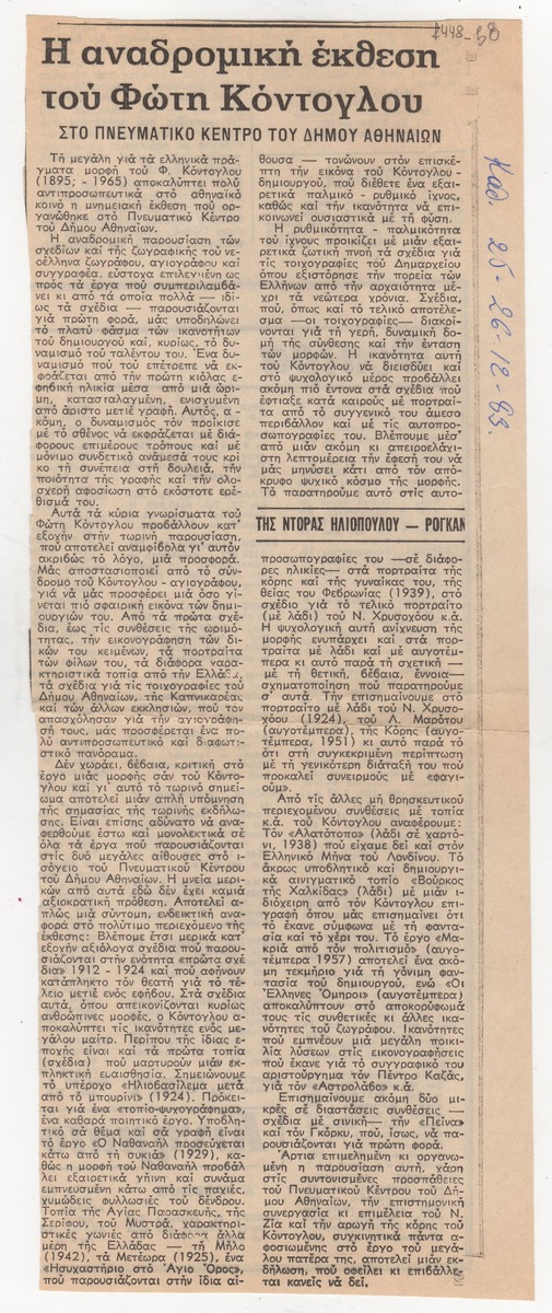 Απόκομμα της εφημερίδας “Η Καθημερινή” (25/12/1983) δημοσίευσης κριτικής έκθεσης του Φώτη Κόντογλου, η οποία διεξάγεται στο Πνευματικό Κέντρο Αθηνών.