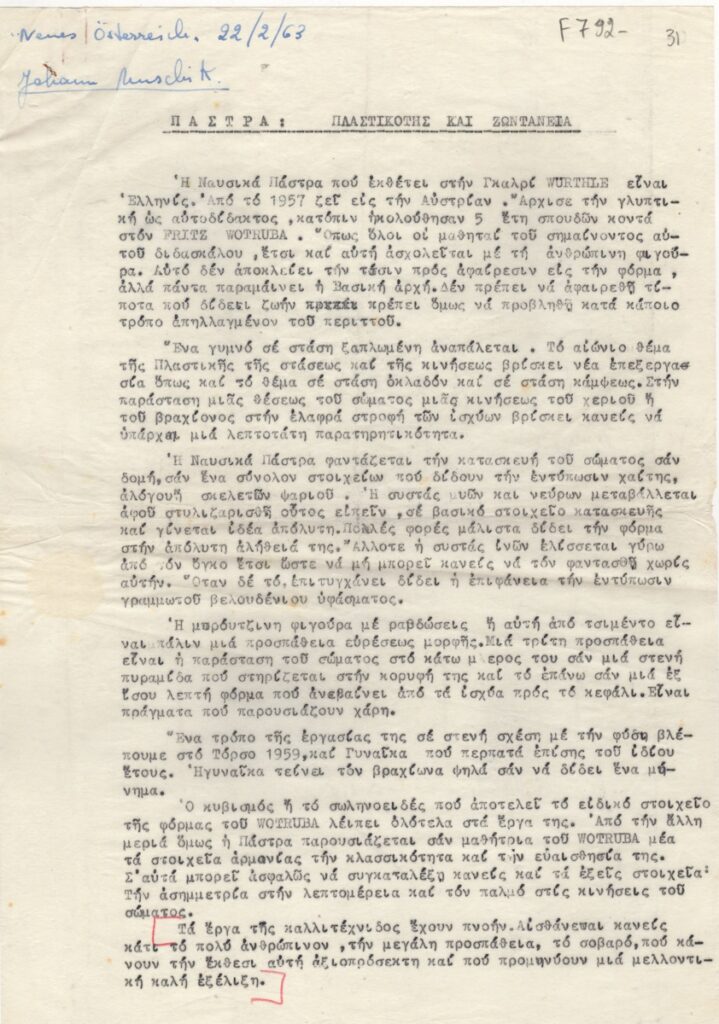 Κείμενο, δακτυλόγραφο, ριζόχαρτο, 30×21 εκ., στα ελληνικά. Πρόκειται για μετάφραση δημοσίευσης κριτικής έκθεσης της Ναυσικάς Πάστρα, η οποία διεξάγεται στην Βιέννη.