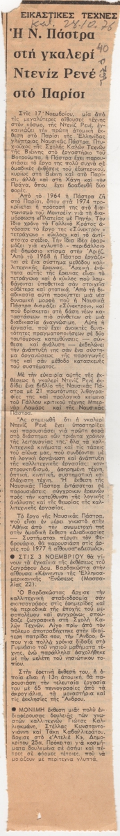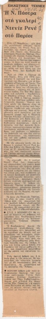 Απόκομμα, χαρτί, 40,5×5,5 εκ., στα ελληνικά, δημοσίευσης αναφερόμενης σε επικείμενα εγκαίνια έκθεσης της Ναυσικάς Πάστρα στο Παρίσι. Δίνονται πληροφορίες για τη ζωή και το εικαστικό έργο της καλλιτέχνιδας.