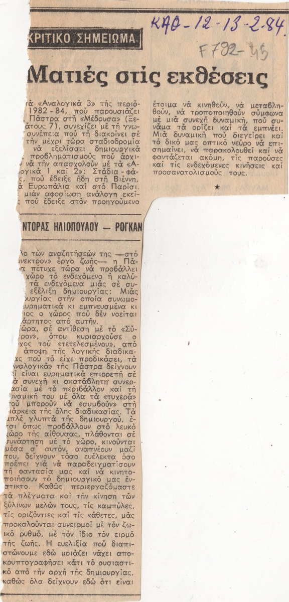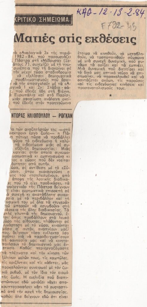 Απόκομμα, χαρτί ακανόνιστου μεγέθους, στα ελληνικά, δημοσίευσης κριτικής έκθεσης της Ναυσικάς Πάστρα, η οποία διεξάγεται στην Αίθουσα Τέχνης Μέδουσα στην Αθήνα.