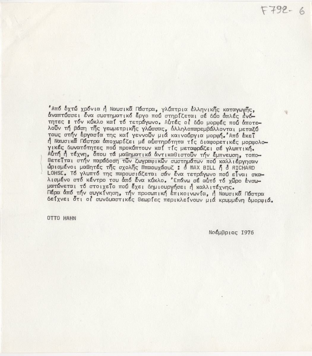 Κείμενο- κριτική, δακτυλόγραφο, χαρτί, 23×21 εκ., στα ελληνικά, για το εικαστικό έργο της Ναυσικάς Πάστρα.
