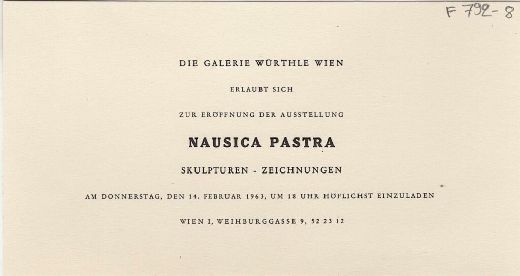 Πρόσκληση, χαρτόνι, 10×18,5 εκ., στα γερμανικά, εγκαινίων έκθεσης της Ναυσικάς Πάστρα στην Βιέννη.